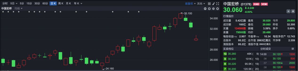 上周四,中国宏桥创出35.1港元的历史纪录后,上周五跌近4%,昨天下跌3.6%,今日盘中最多跌近8%,最终收盘下跌5.88%,全天成交170亿港元,成交额明显放大。从高点跌下来,中国宏桥累计最大跌幅近15%。究竟发生了什么?