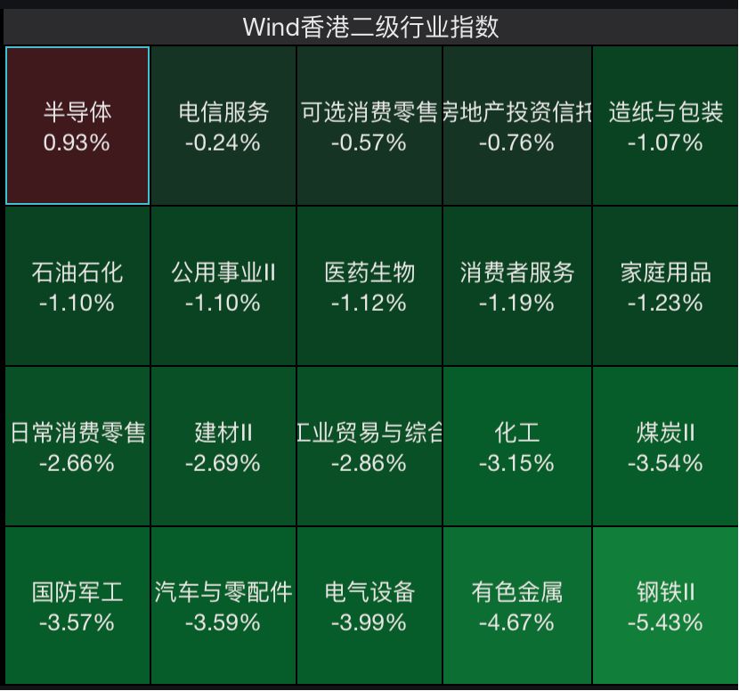 值得注意的是,今日港股板块中,仅有半导体板块逆势走强。其中,华虹半导体(01347.HK)涨超3%,宏光半导体(06908.HK)涨超2%,中芯国际(00981.HK)涨超1%。