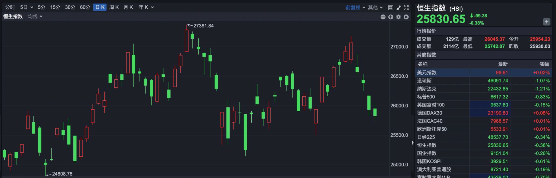 截至收盘,恒生指数报收于25830.65点,下跌99.38点,跌幅0.38%。