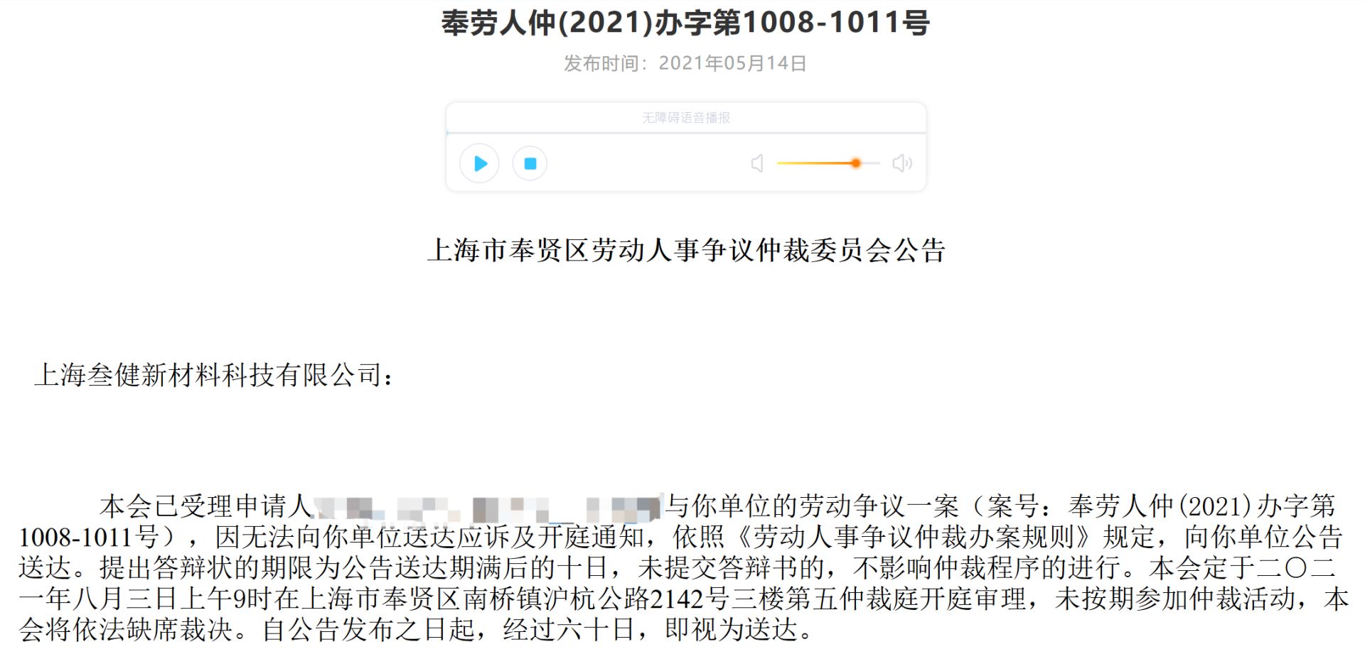 巧合的是,2021年5月,上海市奉贤区人力资源和社会保障局披露了一则受理通知,4名自然人因与上海叁健存在劳动争议,将上海叁健告到仲裁庭。同期披露的详细信息显示,其中至少3人在2020年6月后受聘进入上海叁健工作,但并未签订劳动合同。