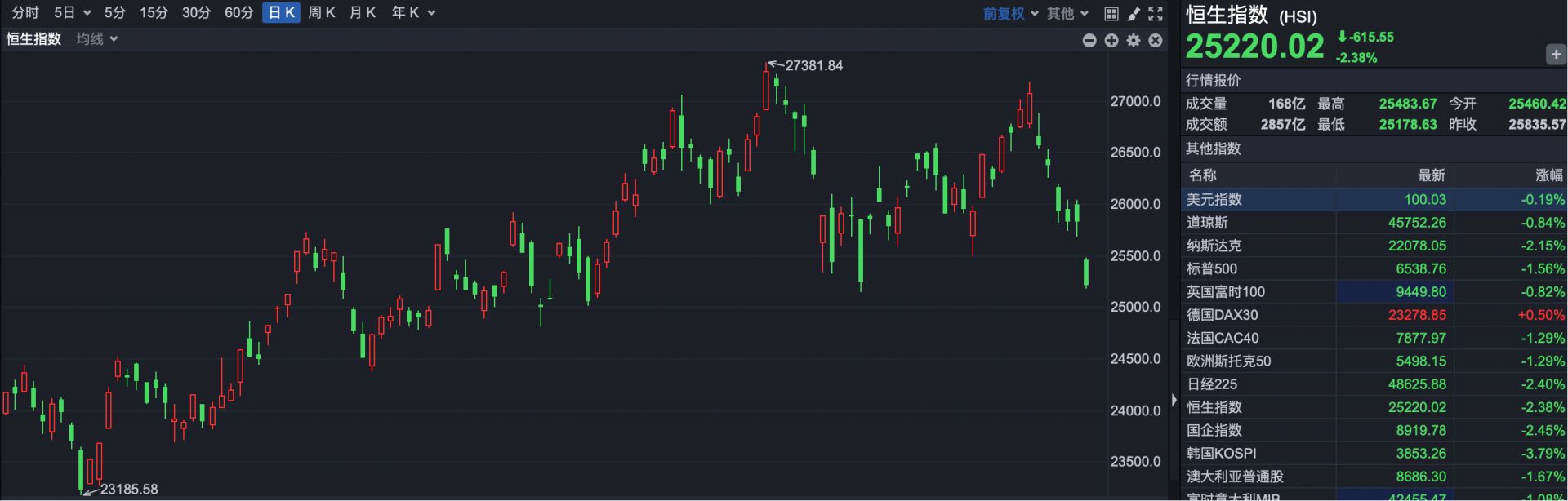 截至收盘,恒生指数报收于25220.02点,下跌615.55点,跌幅2.38%。