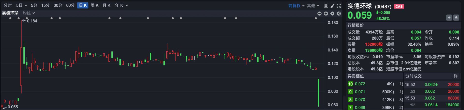 焦点公司方面,今日实德环球(HK00487)遭遇闪崩。盘中,实德环球股价最大跌幅接近50%,最终收盘跌幅48.25%。