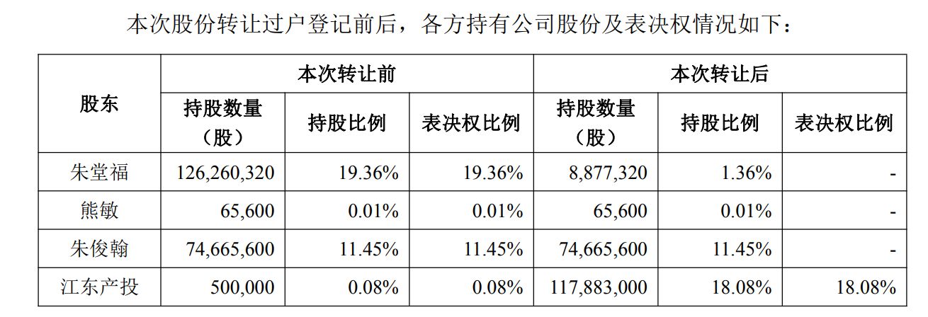 根据公告,今年7月,控股股东朱堂福与江东产投签署《股份转让协议》,约定朱堂福将其持有的1.17383亿股(占总股本18%)以协议转让方式出让给江东产投,转让价格为11.48元/股,转让价款合计13.48亿元。