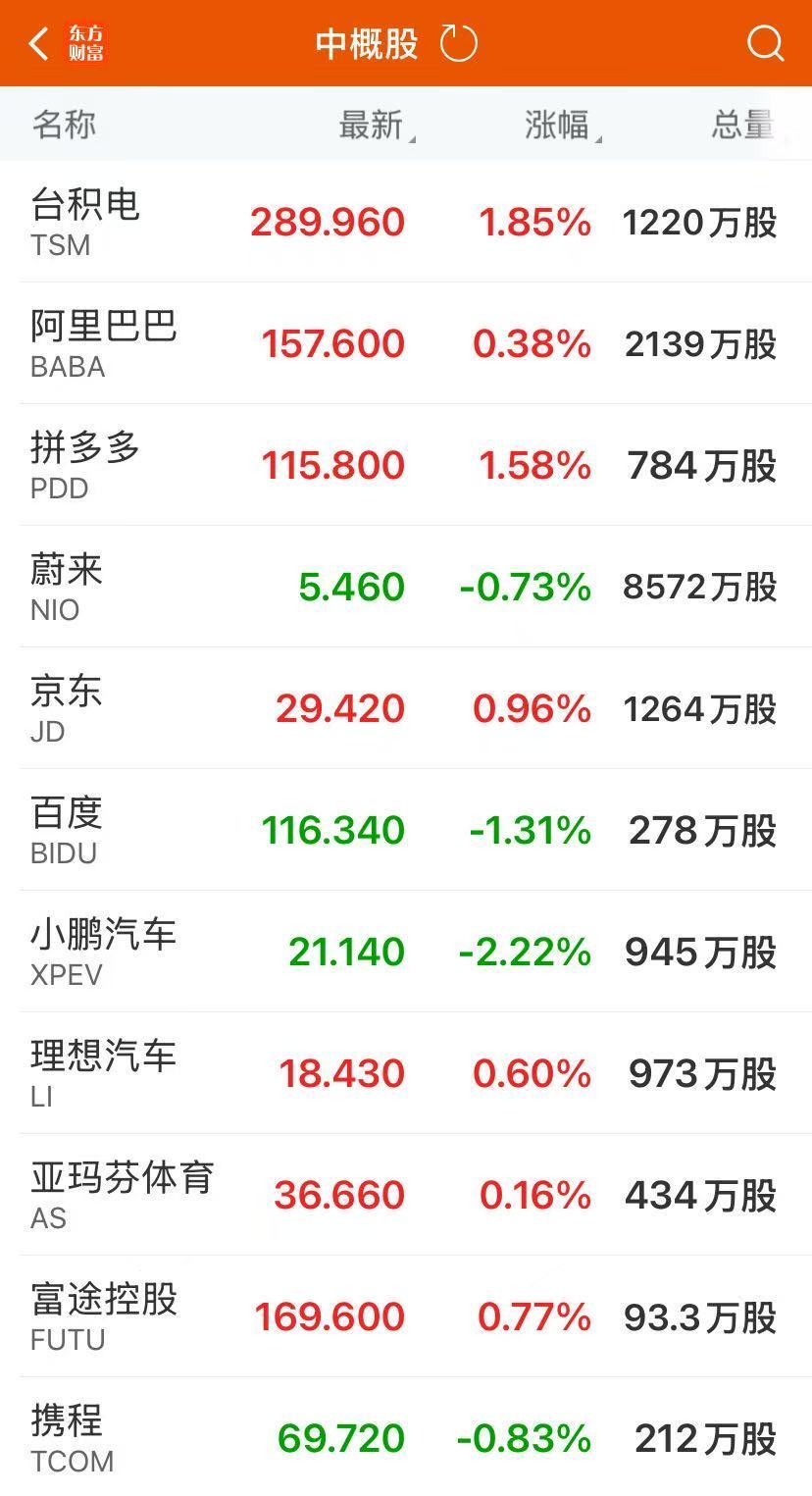 中概股涨跌不一,阿特斯太阳能涨超8%,大全新能源、唯品会涨超2%,满帮集团、亚朵、虎牙、斗鱼涨超1%;禾赛科技跌超7%,涂鸦智能跌逾5%,金山云跌约4%,爱奇艺跌超3%,哔哩哔哩跌超2%。