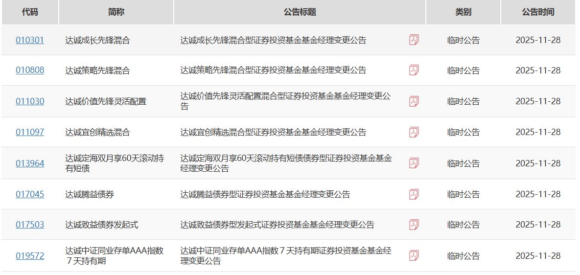 11月28日,达诚基金旗下8只产品集体披露基金经理变更公告,主要包括4只偏权益的产品和4只固收类产品。