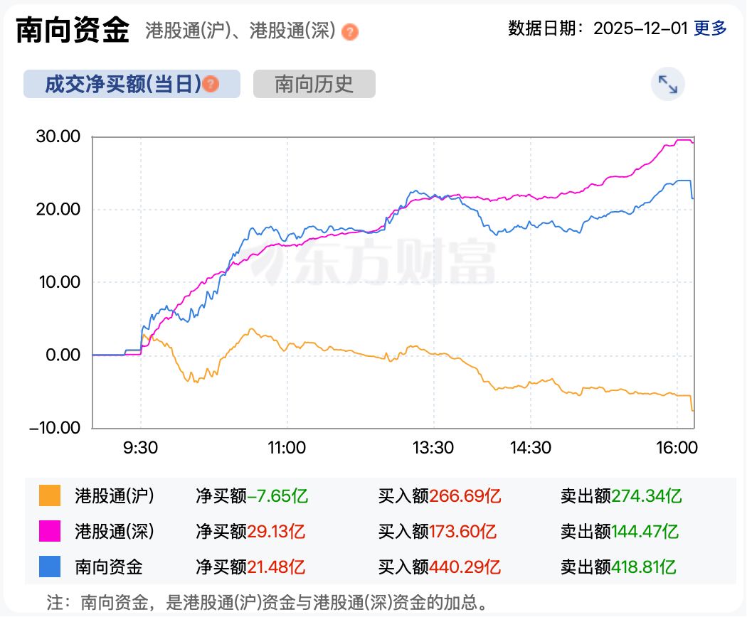 资金方面,今日南向资金小规模净买入港股。截至收盘,南向资金累计净买入港股超21亿港元。