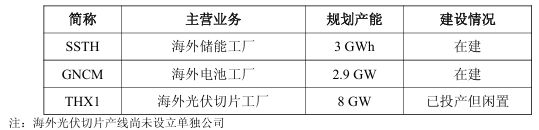 其中,海外储能工厂SSTH规划产能为3GWh(吉瓦时),海外电池工厂GNCM规划产能为2.9GW(吉瓦),海外光伏切片工厂THX1规划产能为8GW。