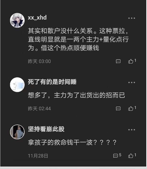 从公开信息来看,11月27日下午,上述求助帖就已经在同花顺社区发布,虽引发部分股民同情,但此时传播范围有限。直到11月28日下午社区大量涌现“为主力点赞”“股市有情”等留言,话题热度逐渐提升。