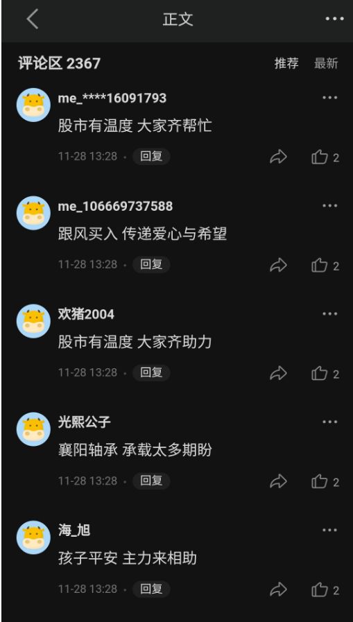 有迹象显示,上述“求助帖”在11月27日发布后的一段时间内并未被市场关注,直到11月28日下午才逐渐开始大量传播(11月27日襄阳轴承股价全天无异常波动,收盘下跌2.33%。11月28日开盘后,该股仍低开低走,直至上午10:20前均处于“水下震荡”状态),显示帖子在发布后至少十几个小时内未被主流资金关注。