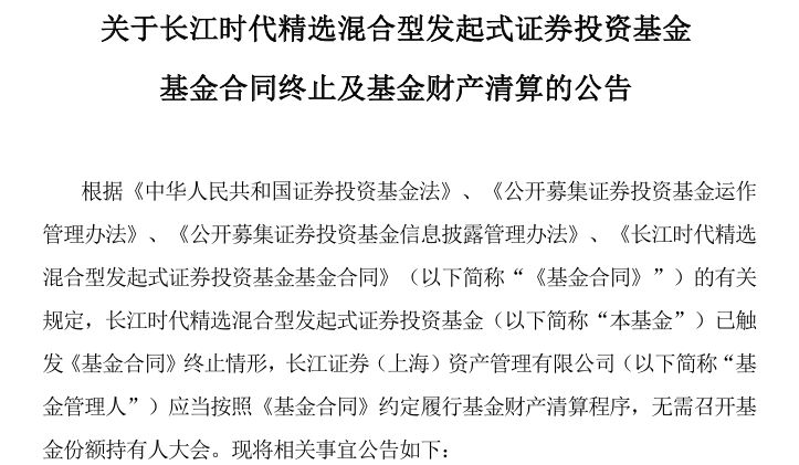 近日,长江证券(上海)资产管理有限公司发布公告称,长江时代精选混合发起基金因触发基金合同约定的自动终止情形,自2025年12月1日起,进入财产清算程序。