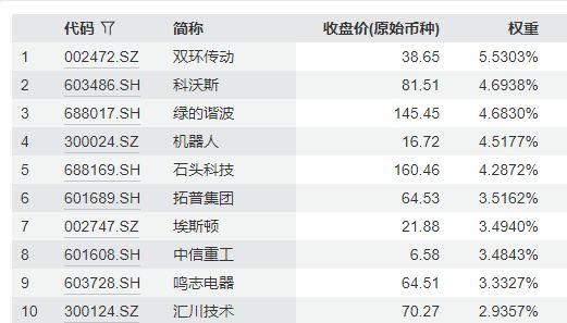 国证机器人产业指数主要权重股