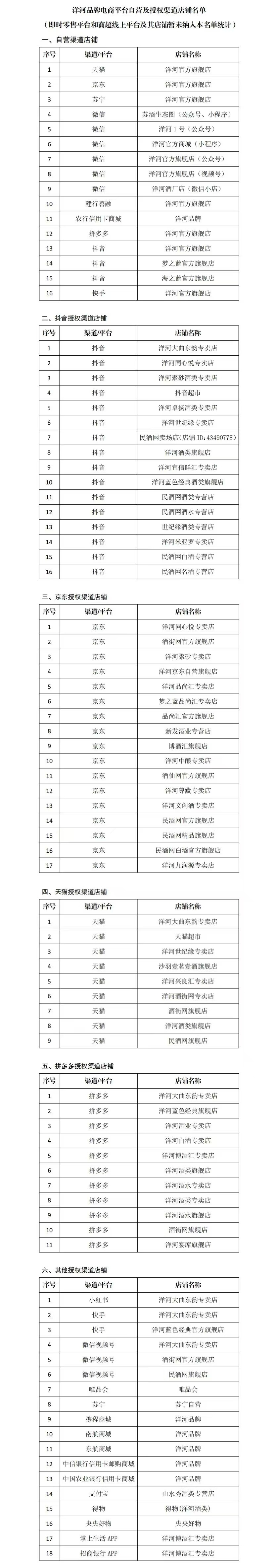 洋河股份发布《告消费者书》,87家线上渠道官方授权店铺名单出炉
