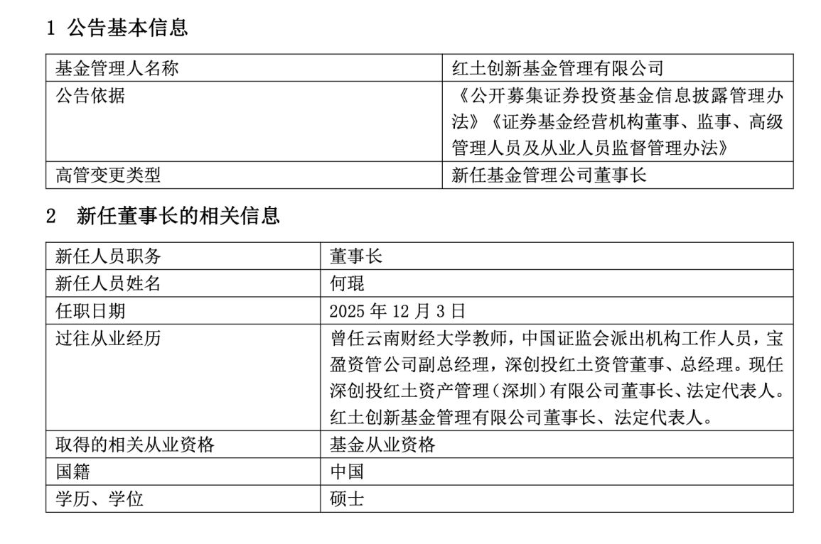 12月5日晚间宣布高管变更的还有红土创新基金。