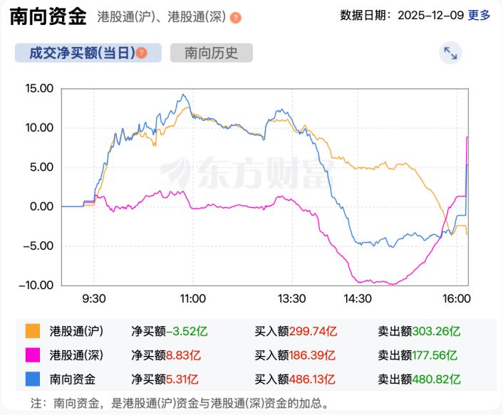 资金方面,截至收盘,南向资金累计净买入港股超5亿港元。