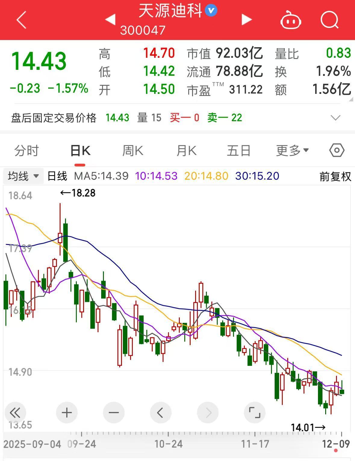 盘面上,截至今日收盘,天源迪科股价跌1.57%,报14.43元/股,总市值92.03亿元。