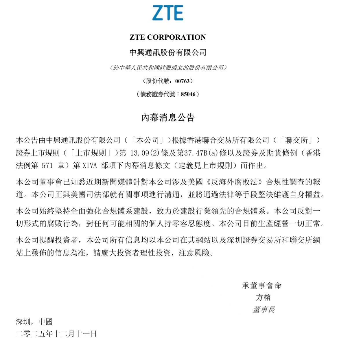 12月11日,中兴通讯(00763.HK)公告,公司已知悉近期新闻媒体针对本公司涉及美国《反海外腐败法》合规性调查的报道。本公司正与美国司法部就有关事项进行沟通,并将通过法律等手段坚决维护自身权益。本公司始终坚持全面强化合规体系建设,致力于建设行业领先的合规体系。本公司反对一切形式的腐败行为,对任何可能相关的个人持零容忍态度。本公司目前生产经营一切正常。