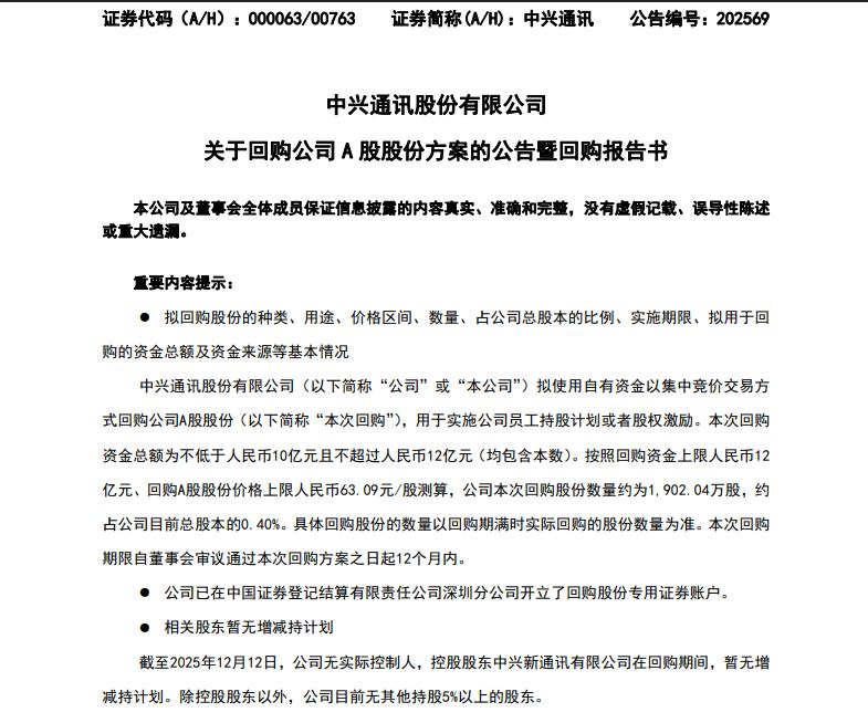 12月12日,中兴通讯(SZ000063)发布公告称,公司拟使用自有资金以集中竞价交易方式回购公司A股股份,用于实施公司员工持股计划或者股权激励。