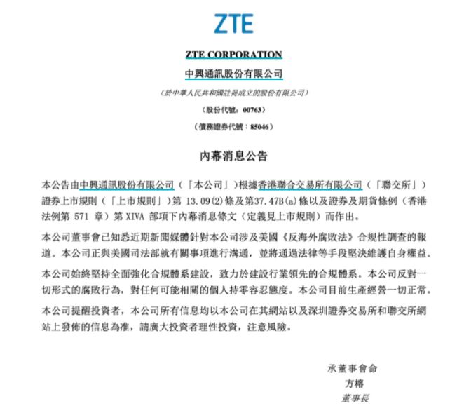 12月11日,中兴通讯在港交所公告称,公司董事会已知悉近期新闻媒体针对公司涉及美国《反海外腐败法》合规性调查的报道。公司正与美国司法部就有关事项进行沟通,并将通过法律等手段坚决维护自身权益。