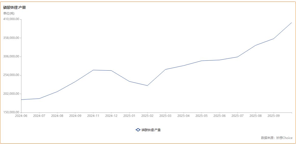 实际上,自今年8月以来,磷酸铁锂的产量就处于持续增长状态。根据东方财富CHOICE数据,8月磷酸铁锂产量为33.7万吨,到了10月则为40万吨。