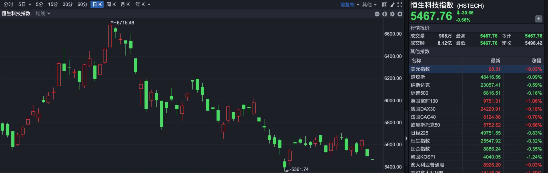 恒生科技指数报5467.76点,下跌30.66点,跌幅0.56%。