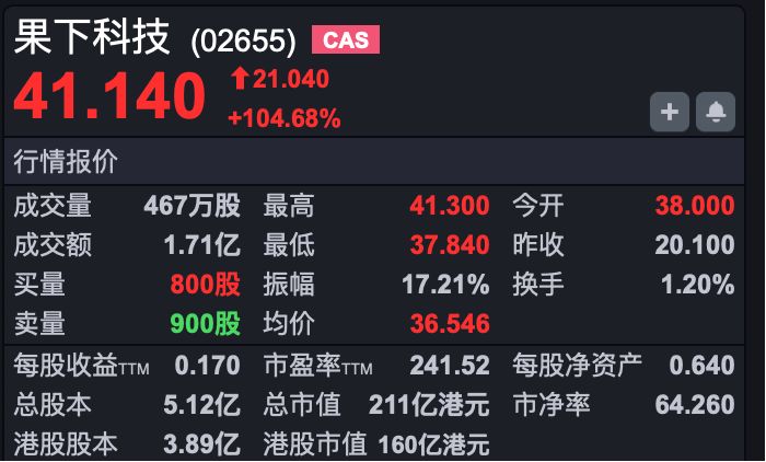 新股方面,果下科技(HK02655)今日上市,股价高开89%,随后持续走高。截至发稿,果下科技涨幅超过104%,最高报41.30港元。招股阶段,公司香港公开发售获1890.73倍认购,国际发售获3.63倍认购。