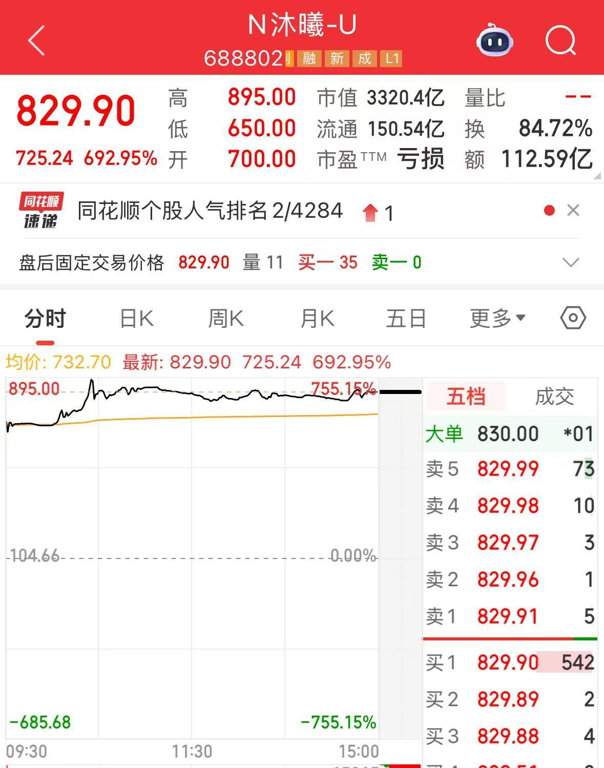 除了打新收益惊人外,沐曦股份今日股价也表现强势,收盘报于829.9元,在超过摩尔线程的同时成功跻身A股股价排行榜第三名,仅次于贵州茅台、寒武纪两只千元股,稳稳站在市场高价股头部核心位置。