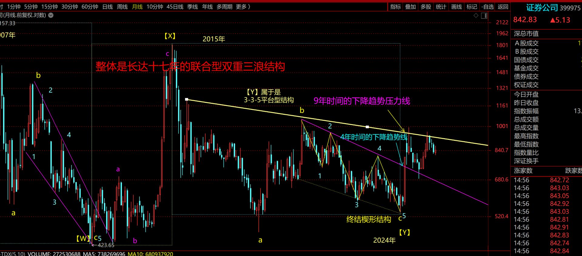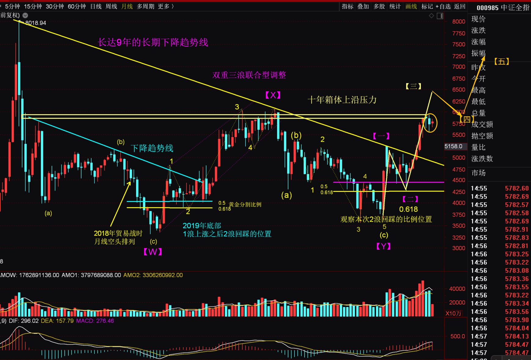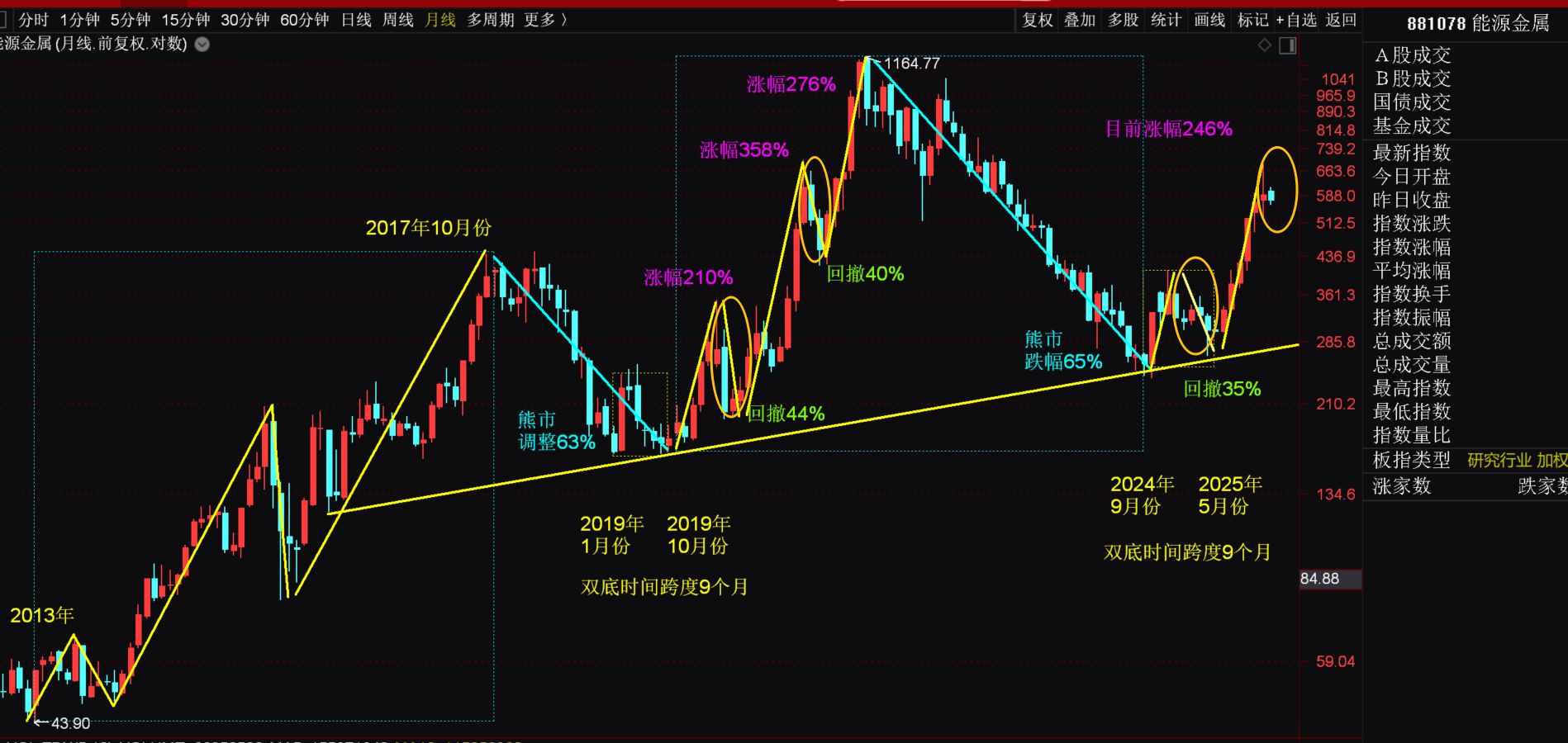 从中证全A指数月线图看,2025年10月的调整倾向是【三】-4的调整。两会之前大概率会运行在【三】-5的上行趋势中,且会创出阶段性新高,这也是首次突破图中标注的近十年的箱体上沿的压力,届时会迎来一个重要的【三】浪顶部区域,建议等完成该目标结构之后需要非常谨慎的控制仓位,因为中证全A指数2026年上半年很有可能会在月线上出现九转序列的高9信号,会进入长达几个月的大【四】浪调整走势,最后在下半年进入大【五】浪冲顶,这是2026年股市整体走势的猜想。