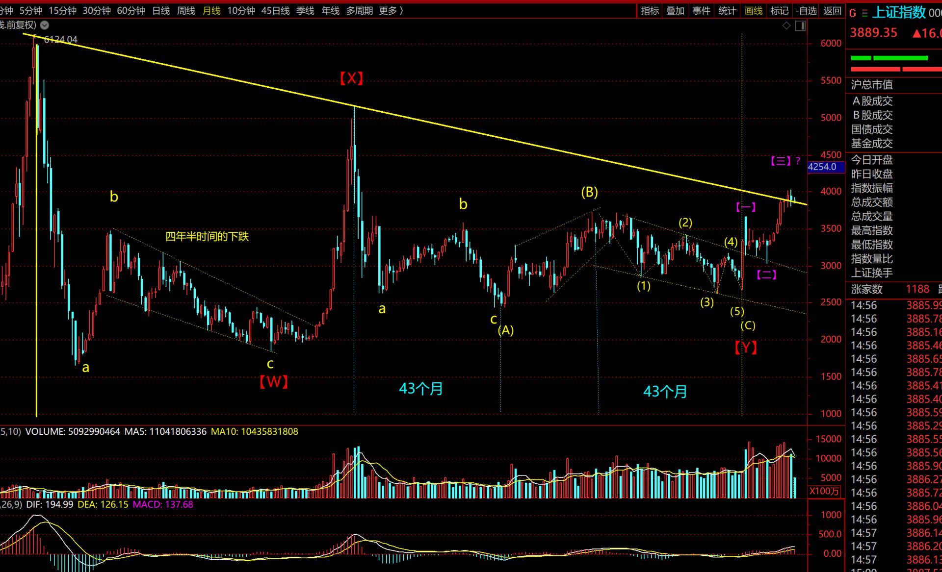 沪指4000点是过去长达十七年时间的下降趋势线压力位置,该压力位自然不会轻易能突破,如以下沪指月线图所示: