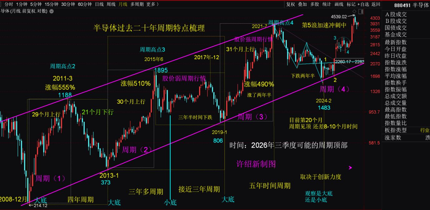 1.对于半导体行业,在去年的分析中重点提到会持续长达两年半左右的上行周期,当前这一轮半导体周期还差最后的5~7个月时间冲顶,倾向2026年上半年半导体仍可重点关注。不过,一旦出现最后的冲刺上涨,等到下半年就不是很建议作为重点关注对象了,届时可将半导体仓位移到部分PPI与CPI行业标的。
