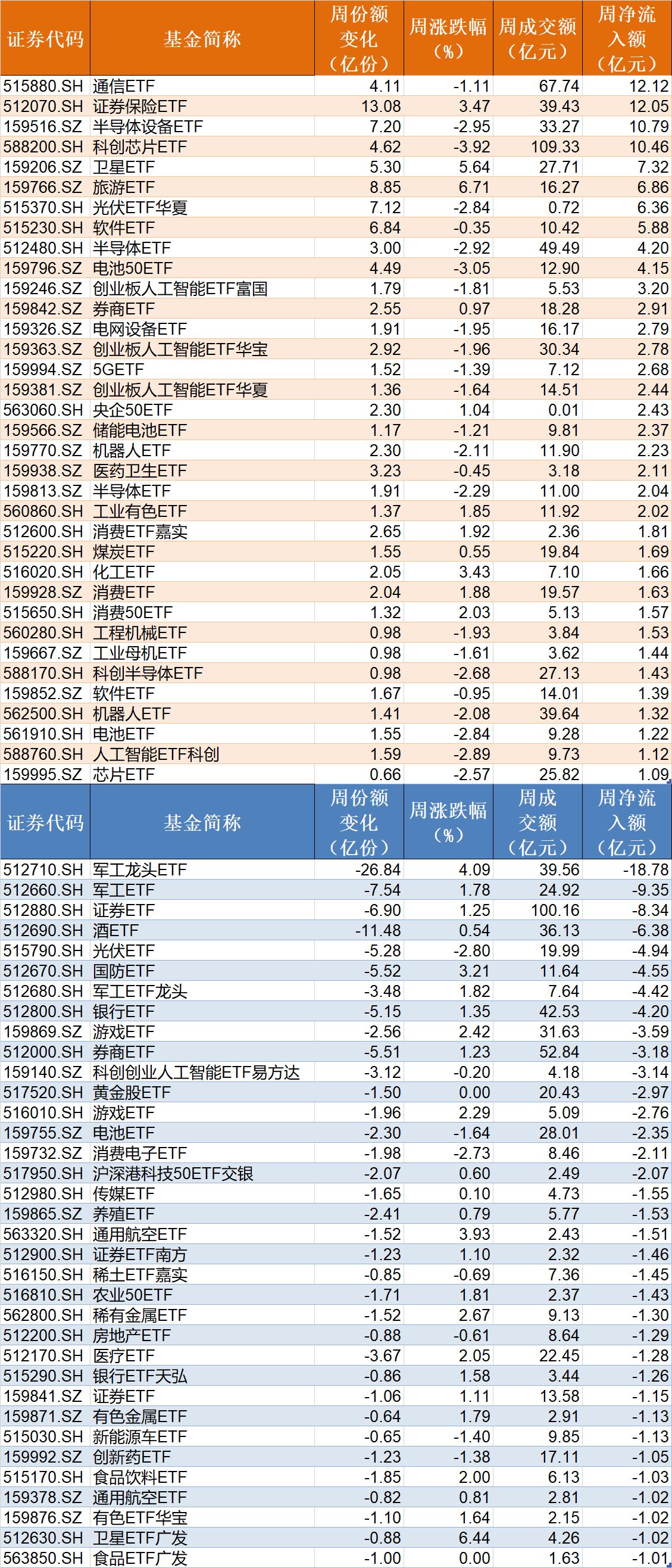 从行业主题上看,通信、证券保险等ETF被资金看好,而军工相关ETF被资金抛售。