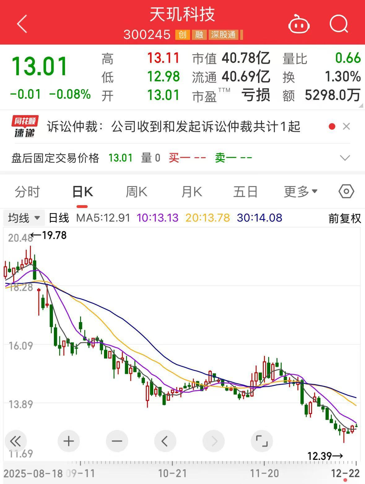 市场上,天玑科技22日收跌0.08%报13.01元/股。