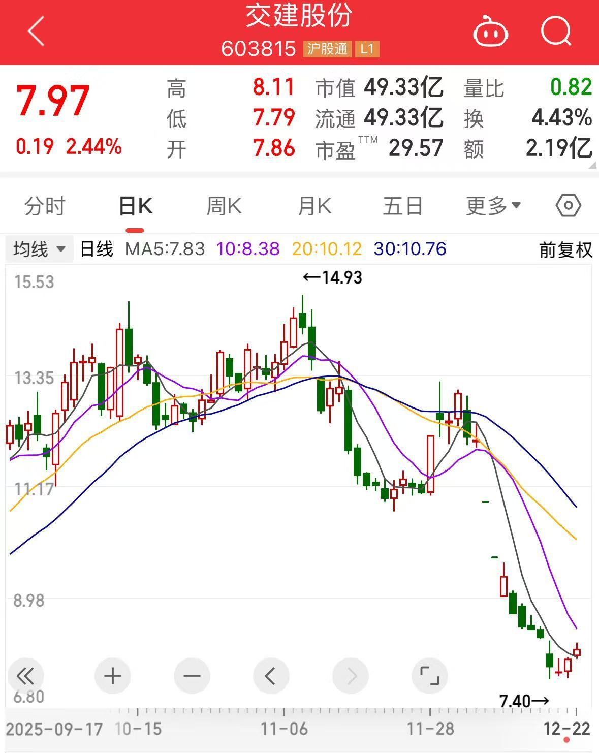 盘面上,截至今日收盘,交建股份股价涨2.44%,报7.97元,总市值49.33亿元。