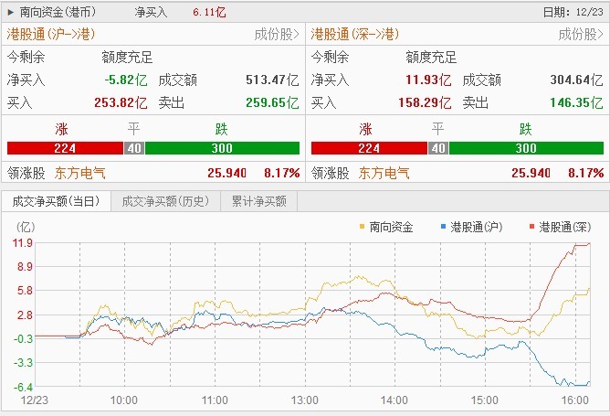 资金流向方面,南向资金继续通过港股通渠道净买入。数据显示,12月23日港股通全天累计净买入6.11亿港元。