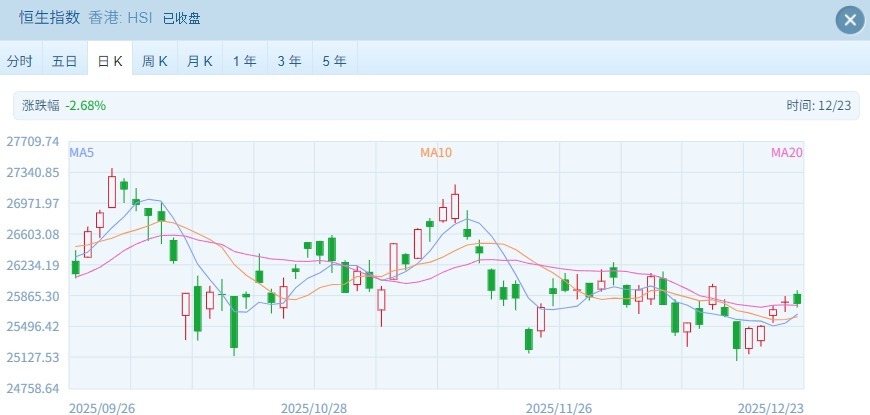 今日(12月23日),港股市场呈现高开低走态势,核心指数震荡下行至收盘微跌。板块方面呈现结构性分化,黄金、风电等避险及高景气赛道领涨,科技股多数走弱;当日上市新股表现两极分化,AI赛道新股受追捧暴涨,另有新股跌破发行价;南向资金延续净流入态势,为市场提供一定支撑。