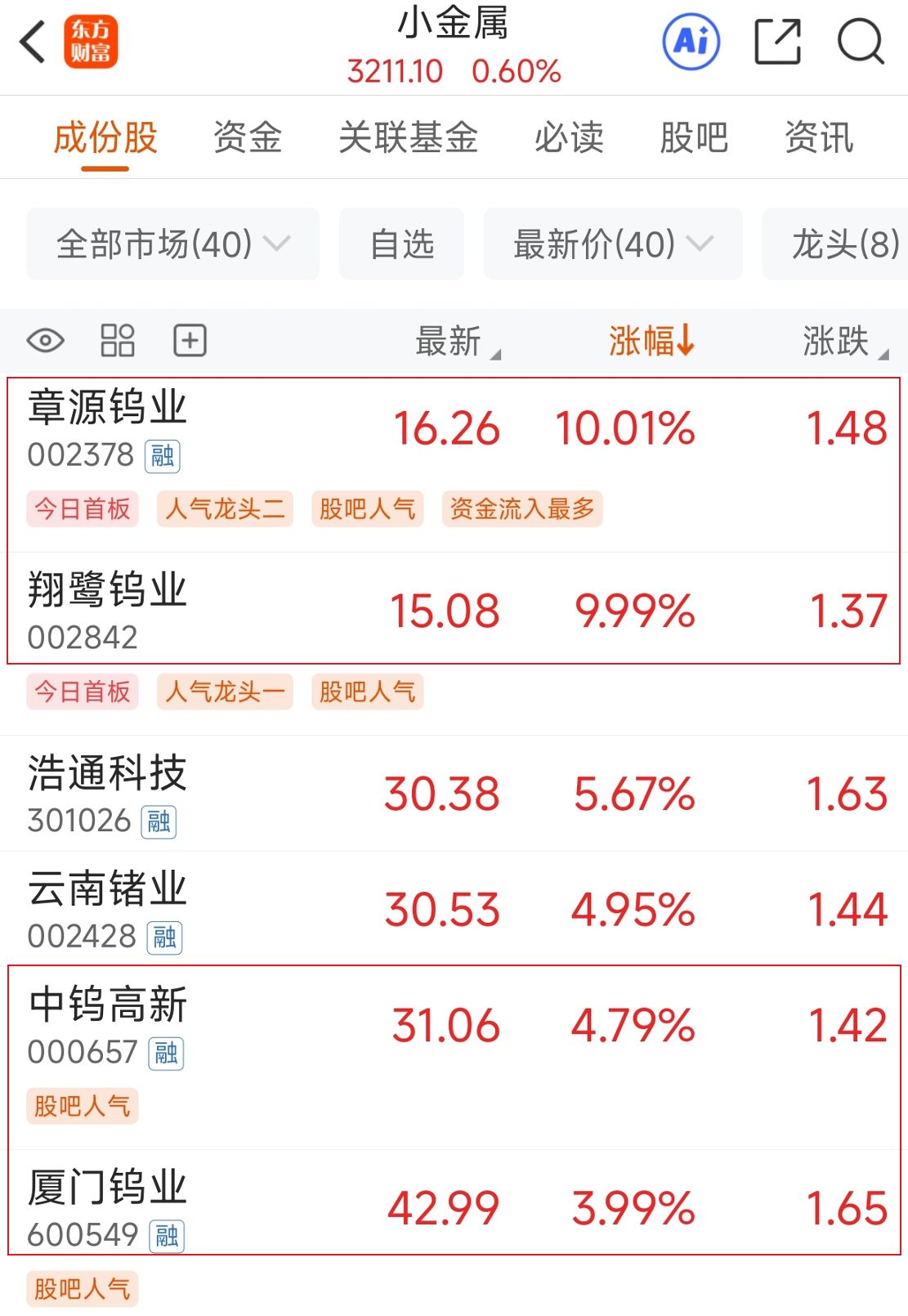 12月23日,翔鹭钨业(SZ002842,股价15.08元,市值44.86亿元)与章源钨业(SZ002378,股价16.26元,市值177.57亿元)强势封死涨停板,厦门钨业(SH600549,股价42.99元,市值656.31亿元)和中钨高新(SZ000657,股价31.06元,市值675.38亿元)的股价也大幅上涨。
