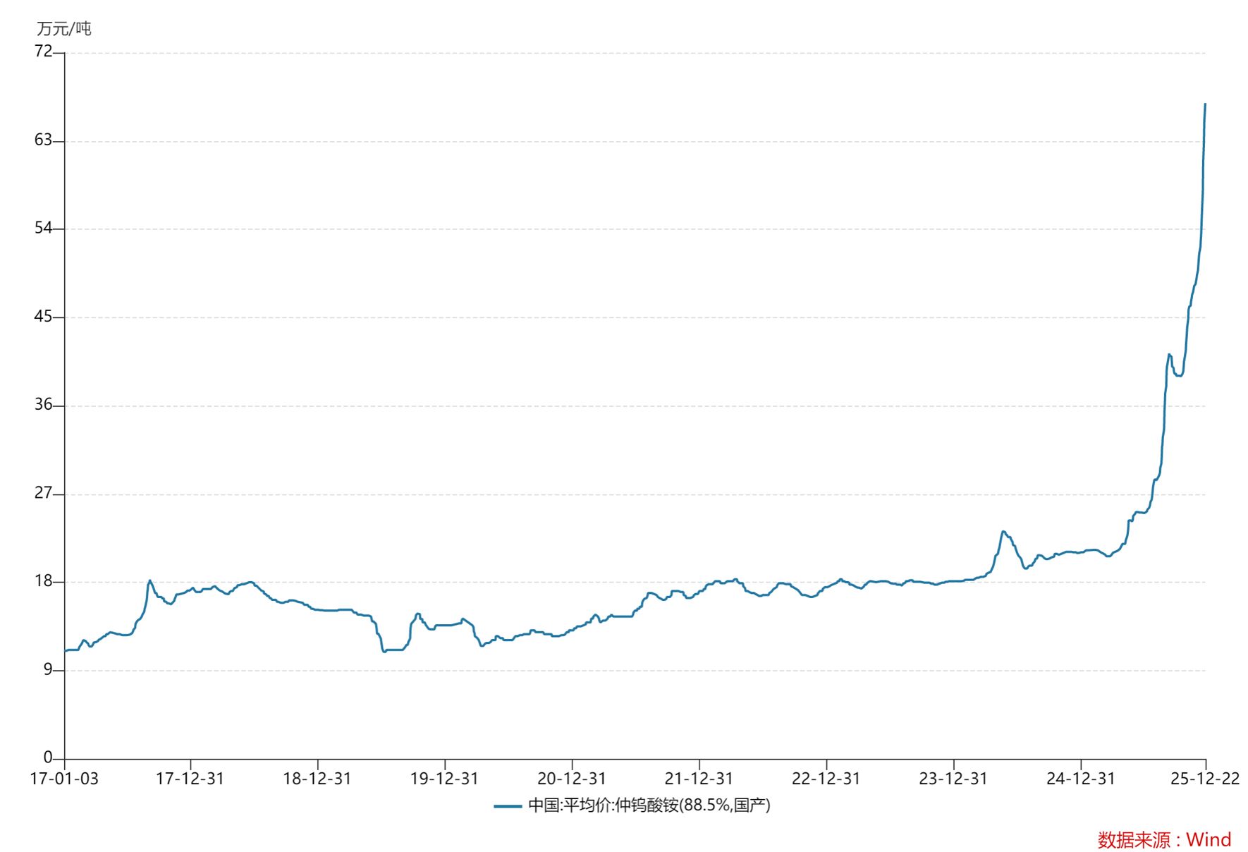 据Wind数据,今年3月以来,仲钨酸铵价格开启了“狂飙”模式,从去年底的21.05万元/吨,到今年12月22日已站上66.85万元/吨的高位。