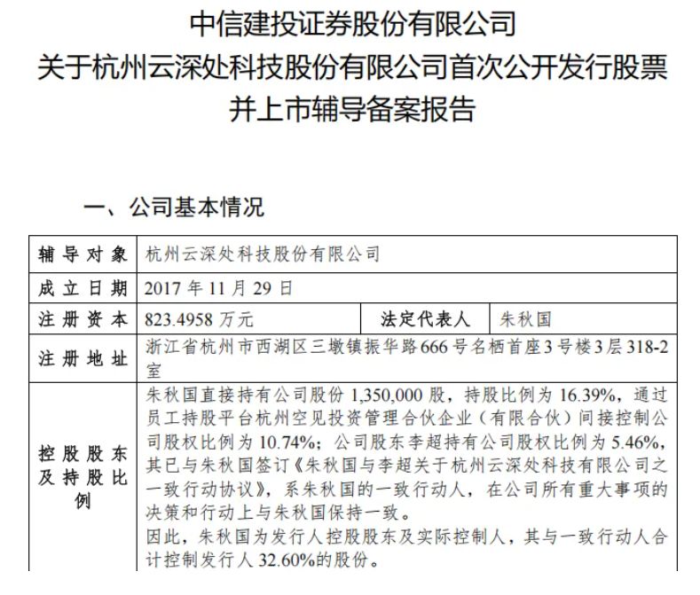 上市辅导备案报告显示,云深处科技成立于2017年11月29日,注册资本达823.4958万元,法定代表人为朱秋国。
