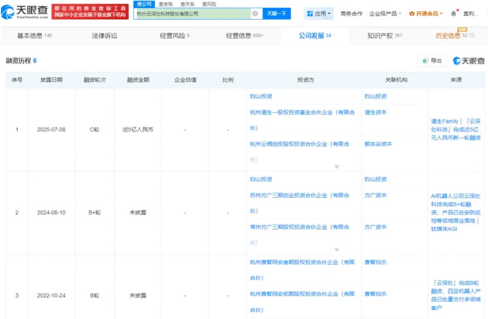 2025年,云深处科技的融资进程加快,7月8日、12月9日,各完成一轮融资。