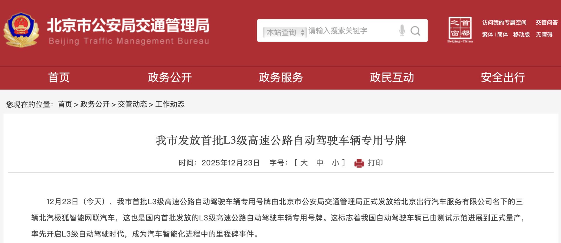 图片来源:北京市公安局交通管理局官网
