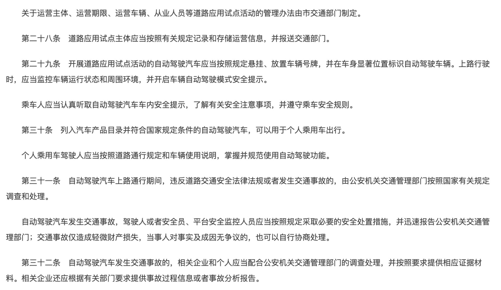例如,北京《条例》第三十条明确规定:“列入汽车产品目录并符合国家规定条件的自动驾驶汽车,可以用于个人乘用车出行。个人乘用车驾驶人应当按照道路通行规定和车辆使用说明,掌握并规范使用自动驾驶功能。”