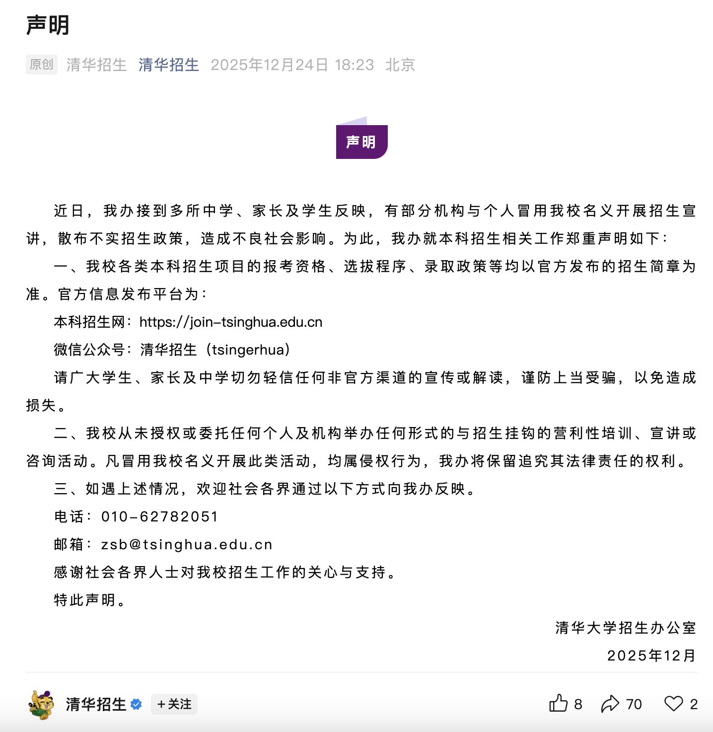 近日,清华大学招生办接到多所中学、家长及学生反映,有部分机构与个人冒用清华大学名义开展招生宣讲,散布不实招生政策,造成不良社会影响。为此,12月24日,清华大学招生办公室就本科招生相关工作发布如下郑重声明: