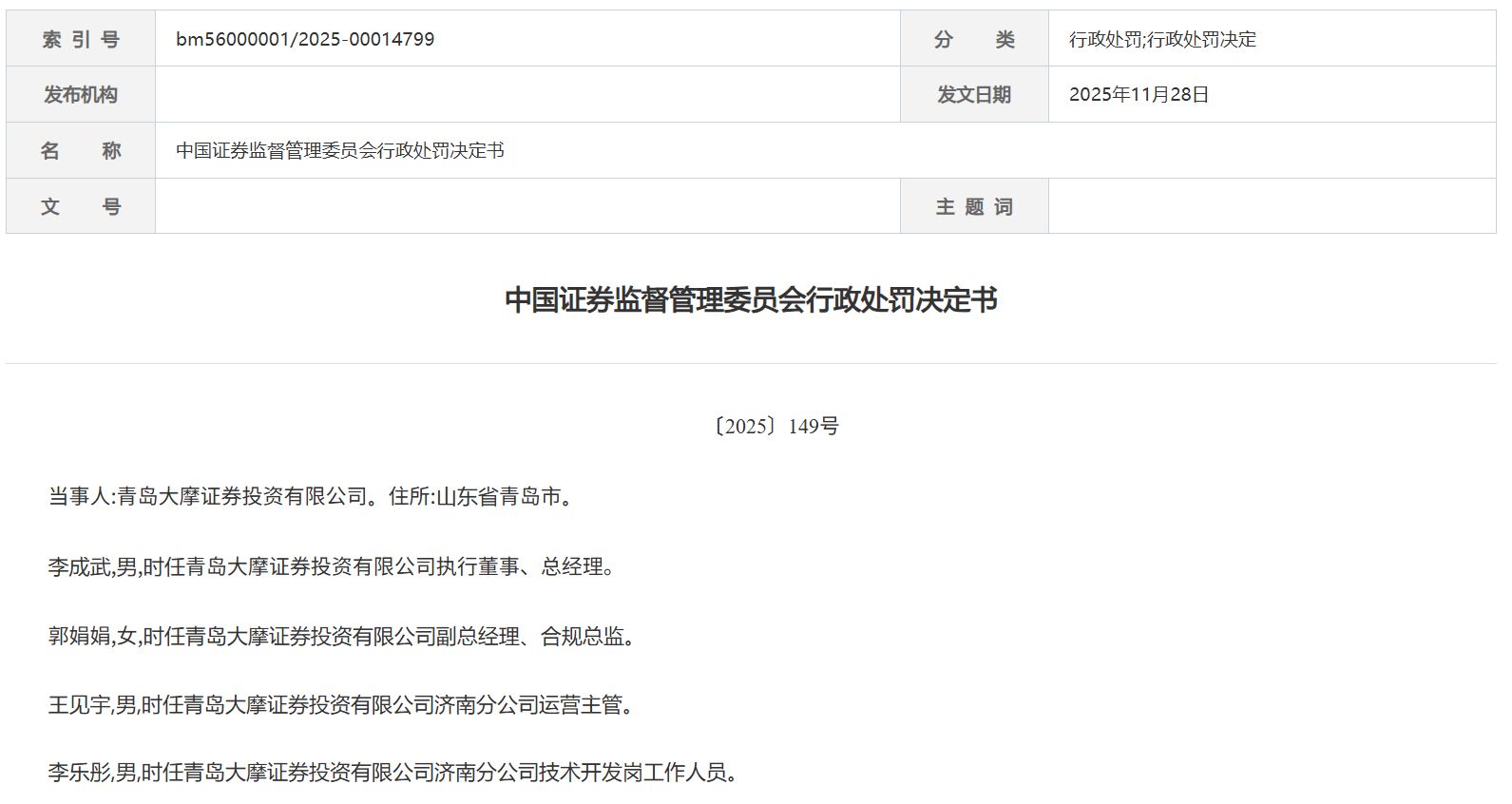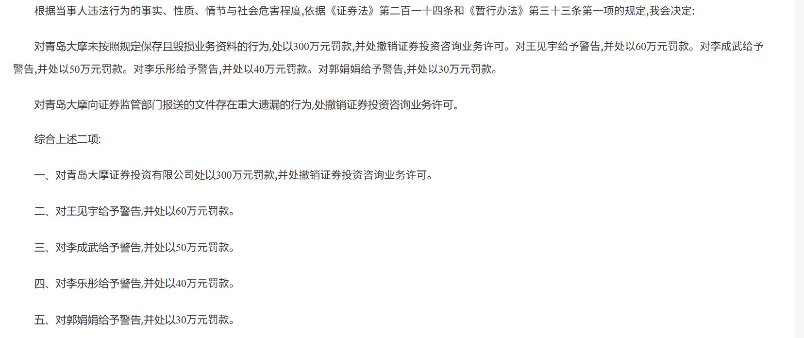 近日,证监会公布的一则行政处罚决定书,对青岛大摩投资而言无疑是一记重拳。这家成立于1997年的老牌投顾机构,被处以300万元罚款,并撤销其证券投资咨询业务许可。