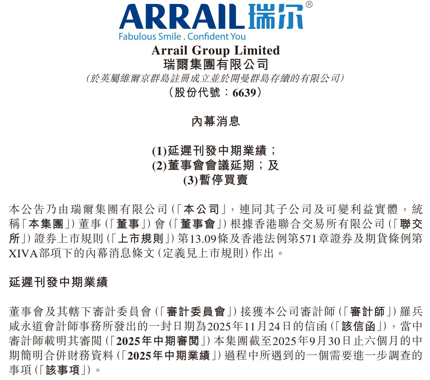 今年12月1日,瑞尔集团公告称,公司董事会及审计委员会接获审计师罗兵咸永道会计师事务所发出的一封信函。审计帅在信函中称,在审阅瑞尔集团2025年中期业绩过程中发现需进一步调查的事项。受调查影响,瑞尔集团已于12月1日上午9时起在联交所暂停买卖,直至刊发2025年中期业绩为止。