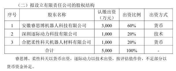 公告显示,三方共同设立的合资公司注册资本为5000万元。其中,睿思博拟以自有资金现金认缴出资3000万元,持有合资公司60%的股权,成为控股股东。逐际动力以技术作价认缴出资1000万元,占注册资本的20%。柔性科天则以现金认缴出资1000万元,占注册资本的20%。