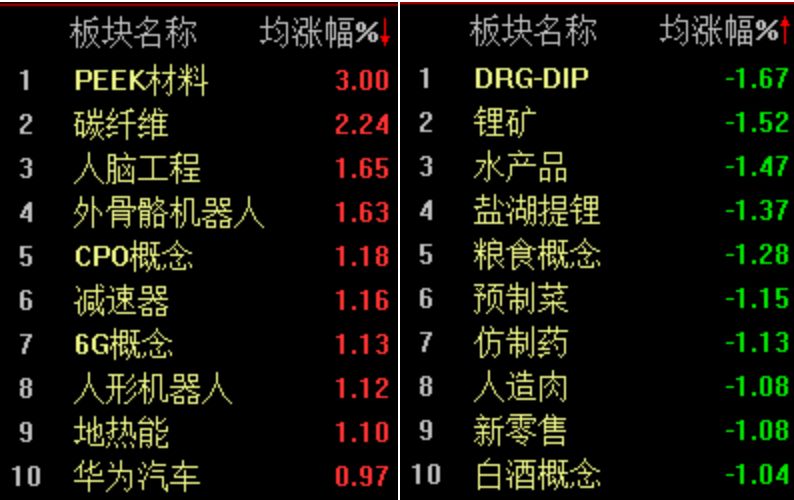 板块方面,碳纤维、PEEK材料、化纤行业、机器人执行器、石油行业、贵金属等涨幅靠前,而医药商业、乳业、社区团购则表现不佳,跌幅靠前。