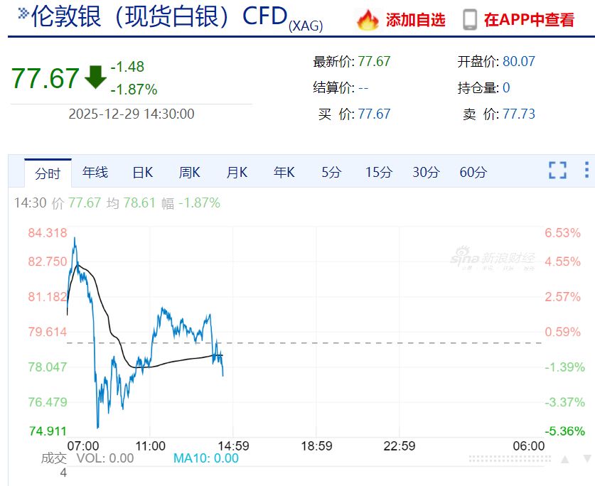 周一,白银市场巨震,上演了“暴涨后急跌”的过山车行情:现货白银开盘暴力拉升,一度上涨逾5%,站上83美元/盎司;随后上演高台跳水,一度跌破75美元,日内振幅达9美元;截至发稿,现货白银价格交投在77美元附近。