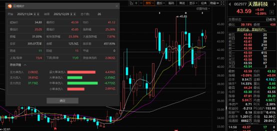 图片来源:东方财富《每日经济新闻》记者还注意到,天箭科技也是近期A股市场的热门个股之一,因为搭上“商业航天”这一热点概念,公司近期受到资金的追捧。东方财富数据显示,11月24日至12月29日收盘,天箭科技在26个交易日内曾收获4个涨停板,期间累计涨幅为25.26%,总成交额达125.5亿元,总换手率达到457.93%。
