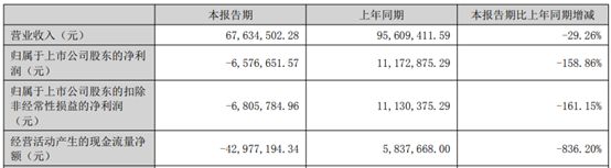 记者注意到,其实天箭科技在今年上半年便已由盈转亏。今年上半年,公司营收同比下滑29.26%至6763.45万元,归母净利润为-657.67万元,而上年同期为1117.29万元。此外,今年上半年公司经营活动产生的现金流量净额也同比从583.77万元大幅下滑至-4297.72万元。