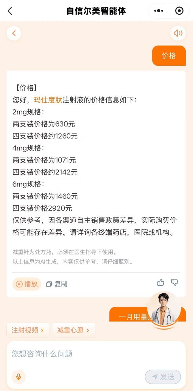 根据玛仕度肽的官方小程序,其2mg(起始推荐剂量)、4支装(月用量)价格为1260元,4mg、4支装为2142元,6mg四支装为2920元。这一价格低于替尔泊肽降价前的月用药成本,但高于司美格鲁肽。