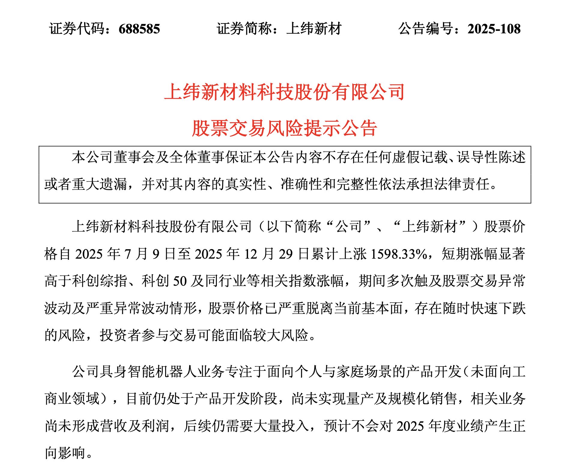 12月29日,上纬新材(688585.SH)公告称,公司股票自2025年7月9日至12月29日累计上涨1598.33%,远超相关指数涨幅。公司具身智能机器人业务仍处产品开发阶段,未实现量产及规模化销售,预计不会对2025年度业绩产生正向影响。公司基本面未发生重大变化,但股价已严重脱离基本面,可能面临较大市场风险。此外,公司市盈率显著高于行业平均水平,存在非理性炒作风险。